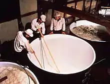Bien que parfois abusivement baptisé vin japonais (Japanese wine) par les Japonais eux-mêmes, le saké, au sens strict de nihonshu, est une « bière de riz », c’est-à-dire une eau de source dans laquelle on a fait étuver et fermenter du riz, après saccharification à l'aide d'une moisissure appelée kōji-kin (麹菌, littéralement « microbe-levure »)[8]. Ce champignon ascomycète, dont le nom scientifique est Aspergillus flavus var. oryzae, permet de se dispenser du maltage utilisé pour d'autres alcools[9]. À la différence de la bière, le saké ne présente toutefois aucune effervescence.