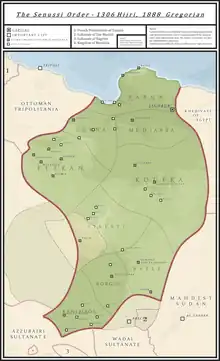 Muhammad Ibn Ali Al-Sanussi fonda en 1843 la première zaouïa de son ordre au Djebel Akdhar, avant d'établir son centre en 1859 dans l'oasis d'al-Djaghbûb. De là, elle[Qui ?] a commencé à étendre son influence en Cyrénaïque, dans le Fezzan et au Tchad, au Soudan et en Égypte.