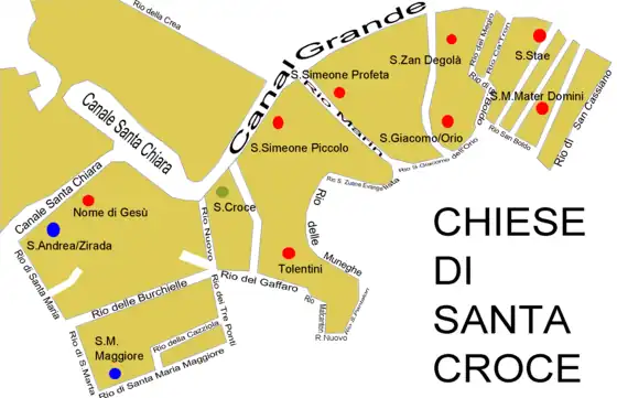On peut y admirer les églises de San Giacomo dell'Orio sur le campo du même nom, San Stae sur le Grand Canal, Église San Zan Degolà, Santa Maria Materdomini, San Simeon Grande et San Simeon Piccolo, cette dernière se trouvant de l'autre côté du Grand Canal face à la gare de Venise-Santa-Lucia, et enfin le grand sanctuaire de San Nicolo da Tolentino.