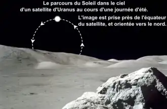 Le parcours quotidien du Soleil dans le ciel d'Uranus et de ses lunes au solstice d'été est relativement similaire à celui de la plupart des autres planètes du Système solaire. Les satellites majeurs ont presque exactement la même obliquité qu'Uranus ; leur axe de rotation est parallèle à celui d'Uranus[3]. Le Soleil trace un cercle dans le ciel autour du pôle céleste d'Uranus et est au plus près à environ 7° de celui-ci[48]. À l'équateur, le Soleil apparait pratiquement au nord ou au sud selon le solstice considéré.