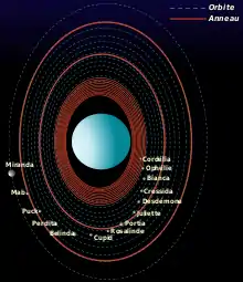 Note : Les satellites d'Uranus sont classés ici par période orbitale croissante. Les satellites suffisamment massifs pour que leur surface ait formé un sphéroïde sont soulignés en bleu clair et sont en gras. Les satellites irréguliers dont les orbites sont progrades sont en gris clair, ceux dont les orbites sont rétrogrades sont en gris foncé.