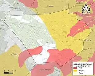 Le retrait-gonflement des sols argileux est susceptible d'engendrer des dommages importants aux bâtiments en cas d’alternance de périodes de sécheresse et de pluie. 57,5 % de la superficie communale est en aléa moyen ou fort (67,4 % au niveau départemental et 48,5 % au niveau national). Sur les 1 181 bâtiments dénombrés sur la commune en 2019, 1 141 sont en aléa moyen ou fort, soit 97 %, à comparer aux 84 % au niveau départemental et 54 % au niveau national. Une cartographie de l'exposition du territoire national au retrait gonflement des sols argileux est disponible sur le site du BRGM[24],[Carte 2].