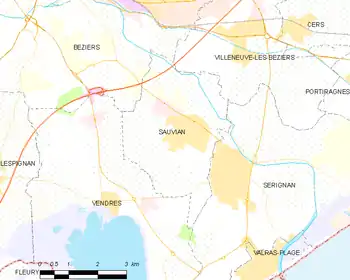 Sauvian est un village situé dans l'ouest du département de l'Hérault, dans la plaine viticole du Biterrois, à 7 kilomètres au sud de Béziers.