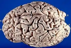| Vue supérieure latérale du cerveau | La scissure inter-hémisphérique coloriée en rouge |