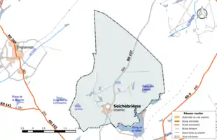 Carte de la commune de Seichebrières et des communes limitrophes.