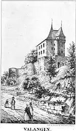 Ce fief était, dans un premier temps, le chef-lieu d'une seigneurie appartenant à une famille du même nom. À partir de 1236 il relevait non seulement des comtes de Neuchâtel mais aussi de ceux de Montbéliard. Plusieurs actes en font foi, le premier de 1283[1], au autre de 1317[2] et un dernier de 1333[3]. Valangin subissait donc une double vassalité. Thierry III de Montbéliard, descendant direct d'Amédée Ier de Montfaucon qui avait épousé une fille de Mangold Ier de Fenis, remettait en 1234 en alleu à l'évêque de Bâle son château et sa ville de Blamont pour lui reprendre en fief. En 1300 l'évêque rendait Blamont au comte de Montbéliard en échange de Valangin, le résultat de ces transactions faisaient que Jean Ier de Valangin se voyait vassal de Montbéliard et arrière-vassal de l'évêque de Bâle[4]. Valangin était entré dans la famille de Neuchâtel par Ulrich III de Neuchâtel-Nidau qui la transmettait à ses fils Berthold Ier de Neuchâtel-Strassberg et Ulrich IV de Neuchâtel-Aarberg. C'est ce dernier qui assurera la lignée de la maison transmettant ce domaine à son fils Jean Ier de Valangin[5].
