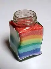 Une fois le sel coloré, on peut soit le verser dans un pot de verre (ancien pot à yaourt par exemple) pour produire des motifs divers, soit sur une feuille de papier : tracer un dessin et y passer de la colle sur les zones à colorer, puis renverser la feuille pour retirer le surplus de sel, et recommencer ainsi pour chaque couleur.