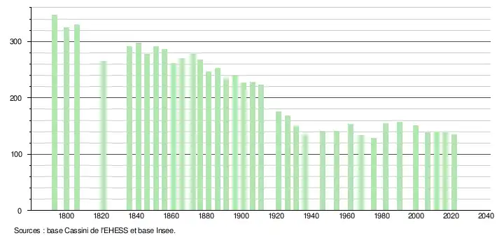 L'évolution du nombre d'habitants est connue à travers les recensements de la population effectués dans la commune depuis 1793. Pour les communes de moins de 10 000 habitants, une enquête de recensement portant sur toute la population est réalisée tous les cinq ans, les populations légales des années intermédiaires étant quant à elles estimées par interpolation ou extrapolation[13]. Pour la commune, le premier recensement exhaustif entrant dans le cadre du nouveau dispositif a été réalisé en 2006[14].