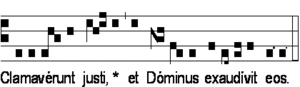 ♦ Le graduel Qui sedes, répertorié sous le septième mode, est très perturbé (que ce soit sur le plan mélodique ou modal). Dans le graduel vatican, des passages entiers sont effondrés d'une quinte par rapport à la version qu'en donne le graduel Dominicain.