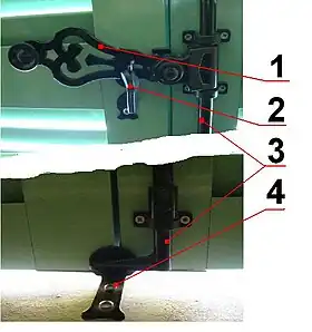 La poignée (1) permet de faire tourner la tige (3) dont les extrémités sont pliées pour venir s'appuyer derrière les gâches (4) fixées sur le bord et le linteau de la fenêtre. La poignée vient ensuite se rabattre derrière la gâche (2) fixée sur l'autre battant.
