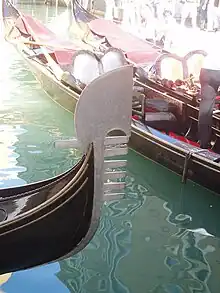Les sestiere de Venise sont symbolisés par les six barres horizontales parallèles s'étendant l'une au-dessus de l'autre sur le fer de proue des gondoles. La courbure de la décoration représente le Grand Canal. Une dernière barre, dirigée vers l'arrière en sens inverse des six autres, symbolise la Giudecca.