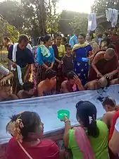 Au monastère, les moines sont réunis pour présider la cérémonie et recevoir leur jeune protégé ainsi que diverses aumônes et offrandes. Un festin a été préparé pour tous, avec des tables rondes basses posées sur de fines nattes et tapis de bambou ou dans un chapiteau avec de longues tables et bancs de bambou. Cette journée aura été déclarée "journée sans fumée" (မီးခိုးတိတ် migo deik) pour le village car aucun feu de cuisson ne sera allumé et tout le monde, y compris les chiens, sera le bienvenu au festin qui comprendra des plats de viande et de volaille, une soupe ou un bouillon, du poisson salé au curry avec des légumes à part, des mangues vertes fermentées ou des germes de haricots suivis d'un dessert, toujours avec du lahpet.