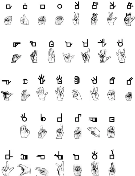 Ces formes de base sont modifiées avec des lignes qui dépassent de leurs faces et coins pour représenter des doigts qui ne sont pas positionnés comme décrit ci-dessus. Les lignes droites représentent les doigts droits (ceux-ci peuvent être à un angle pour indiquer qu'ils ne sont pas alignés avec la paume; s'ils pointent vers ou loin du signataire, ils ont une forme de diamant à la pointe); lignes courbes pour les doigts courbes (en forme de coupe); lignes crochues pour les doigts crochus; lignes à angle droit, pour les doigts pliés à une seule articulation; et les lignes croisées, pour les doigts croisés, comme indiqué dans le tableau à droite. Le pentagone et C ne sont modifiés que pour montrer que les doigts sont écartés plutôt qu'en contact; l'angle n'est modifié que pour indiquer si le pouce touche le bout des doigts ou s'il fait saillie sur le côté. Bien qu'il existe des généralisations qui peuvent être faites pour les dizaines d'autres glyphes, qui sont basées sur le cercle et le carré, les détails sont quelque peu idiosyncratiques et chacun doit être mémorisé.