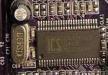 Un signal d'horloge est produit par un générateur d'horloge, ici dans un ordinateur de bureau, constitué d'une puce (à droite) et d'un résonateur (à gauche).