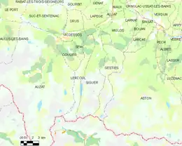 Les communes les plus proches[Note 1] sont[4] : Gestiès (0,7 km), Lercoul (1,7 km), Illier-et-Laramade (3,3 km), Capoulet-et-Junac (3,8 km), Sem (3,8 km), Lapège (4,1 km), Miglos (4,1 km), Orus (5,1 km).