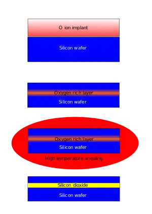 La mise en œuvre est délicate car il faut respecter la continuité du substrat de silicium. L’idée consiste à faire naître l’isolant à l’intérieur du silicium par une technique dénommée SIMOX (ou Separation by IMplantation of Oxygen, une injection à très haute température d’oxygène purifié)[7].