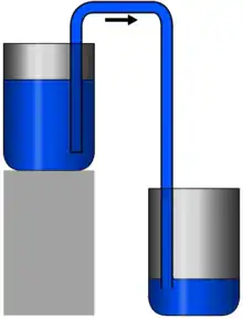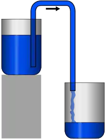 Lorsque l'autre extrémité (sortie) du tuyau est descendue à un niveau inférieur au niveau du réservoir, le liquide s'écoule. L'énergie nécessaire au mouvement est celle de la chute du liquide entre le niveau du réservoir supérieur et la hauteur du tuyau de sortie s'il est à l'air libre, ou le niveau d'un réservoir inférieur, si le tuyau y plonge. La profondeur à laquelle se trouve l'extrémité d'entrée n'intervient pas (tant qu'elle reste plongée dans le liquide).