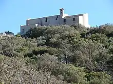 Vue du territoire depuis la chapelle Notre-Dame-du-Mai ; les îles du Gaou et des Embiez à gauche ; le fort de Six-Fours à droite. | |||||