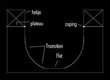 - Le half-pipe ou rampe : il s'agit d'une rampe en forme de U, dans laquelle les skateurs effectuent des va-et-vient, prenant de la vitesse et effectuant de part et d'autre des tricks divers. À l'extrémité du half-pipe se trouve un rail de forme tubulaire appelé « coping », et sur lequel peuvent se faire des slides ou des grinds aussi bien que des tricks plus particuliers (tricks au coping). Le nom « half-pipe » signifie en anglais « demi-tube », une dénomination qui parait évidente lorsque l'on considère la forme du module.