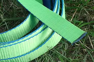 Appelée aussi ligne, ou tout simplement slackline ou slack, la sangle est l'élément principal dans la pratique de la slackline. De nombreux types de sangle existent, faisant varier la masse linéique, l'élasticité, la résistance à la rupture… en fonction des dimensions, ainsi que de la matière et du type de tressage utilisés dans la fabrication de la sangle.