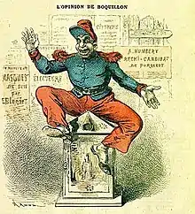 - Dessin extrait de : Les Fredaines de la chanson. Souvenir de Pomponne-les-Bois, 20 août 1876, éditeur : imp. de Vve Ethiou-Pérou et A. Klein, Paris 1877, page 18. La même page reproduite dans Commons.