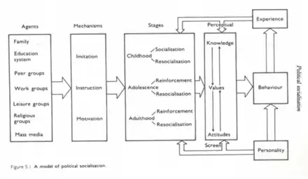 - La famille : la famille est l'agent de socialisation le plus influent. Les familles perpétuent des valeurs qui soutiennent les autorités politiques et qui contribuent grandement à la formation des premières idéologies politiques de l'enfant, ou ses premières affiliations de parti. Les enfants ont d'abord tendance à reproduire le comportement politique de leurs parents comme modèle. C'est d'abord un processus passif, où les enfants croient à ce que leurs parents croient. Les familles ont un effet sur la connaissance politique, l'identification et la participation. La communication a un rôle essentiel dans la transmission de valeurs politiques au sein d'une famille.