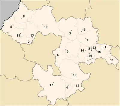Les noms de localités en caractères gras ont le statut de ville (en bulgare : град, translittéré en grad). Les autres localités ont le statut de village (en bulgare : село translittéré en selo).