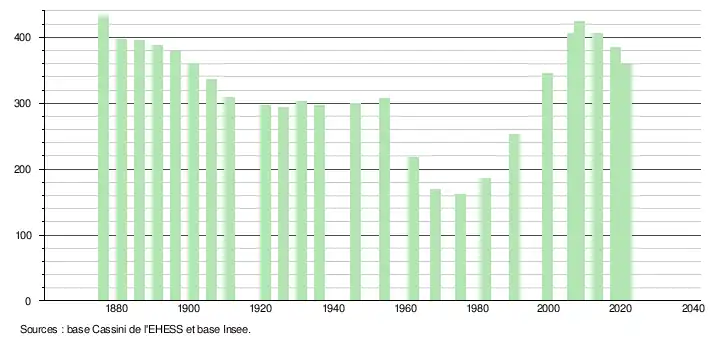 L'évolution du nombre d'habitants est connue à travers les recensements de la population effectués dans la commune depuis 1876. Pour les communes de moins de 10 000 habitants, une enquête de recensement portant sur toute la population est réalisée tous les cinq ans, les populations légales des années intermédiaires étant quant à elles estimées par interpolation ou extrapolation[42]. Pour la commune, le premier recensement exhaustif entrant dans le cadre du nouveau dispositif a été réalisé en 2008[43].
