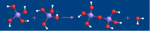 Cette réaction forme un pont siloxane (Si-O-Si) à partir de la condensation de deux groupements silanol et libère une molécule d'eau. Elle peut aussi avoir lieu entre un groupement éthoxy et un groupement silanol pour former un pont siloxane et libérer une molécule d'éthanol. Ces ponts siloxanes sont les unités de base du polymère inorganique. Dans les architectures moléculaires ainsi formées la « brique de base » est un tétraèdre (SiO44−) au centre duquel se trouve l’atome de silicium (figure 3), on retrouve d’ailleurs cette brique dans les verres à base de silice élaborés à haute température. Pour le TEOS, la réaction de condensation présente une vitesse minimale pour un pH de 2 ou 3. Pour des pH élevés, la réversibilité de la réaction peut devenir importante. Pour un précurseur R'-Si(OR)3 où R' est un groupement organique non-hydrolysable, la vitesse minimale de condensation est déplacée vers pH=4.