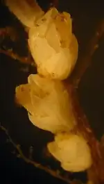 Caractère très particulier, elle ne se fixe pas sur les roches mais principalement sur les coquilles du bivalve Aequipecten opercularis, les coquilles de Buccinum undatum habitées par le pagure Eupagurus bernhardus, la cuticule de crustacés (araignée de mer, Maia squinado, homard, Homarus gammarus) et certains cnidaires dont la gorgone Eunicella verrucosa. Enfin sur divers objets en matière plastique, dont les casiers à crustacés[3],[6].