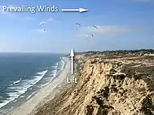 Près de falaises verticales, il y a généralement une zone de turbulence avec de l'air descendant près de la base de la falaise mais également une ascendance exploitable[4]. Orville Wright a ainsi utilisé ce phénomène, établissant un record de durée de vol de 11 minutes en 1911. De l'autre côté du relief, des ondes orographiques (et des rotors) peuvent se former, utilisables aussi par les pilotes de planeurs pour gagner de la hauteur[4].