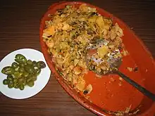 - d'une saucisse locale, telle que le boudin épicé botifaro (boutifaron) ou le camaiot.