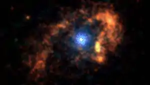 ![]() Le magnetar SGR 1900+14 est exactement au centre de l'image, qui montre un anneau entourant de gaz sur 7 al à travers les rayons infrarouges, comme on le voit par le télescope spatial Spitzer. Le magnetar lui-même n'est pas visible à cette longueur d'onde, mais il a été observé aux rayons X. |