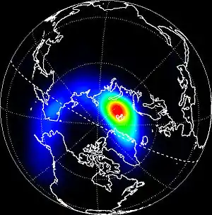 ![]() Cette image est la première image de la Terre aux rayons X, prise en mars 1996, avec le satellite Polar en orbite. La superficie de l'émission de rayons X la plus brillante est en rouge. Ces rayons X ne sont pas dangereux, car ils sont absorbés par les parties inférieures de l'atmosphère de la Terre. |