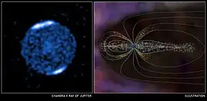 ![]() Jupiter montre une intense émission de rayons X au niveau des aurores polaires (image de l’observatoire Chandra à gauche). Le schéma adjacent illustre comment la production de l'activité aurorale de Jupiter est anormalement fréquente et spectaculaire. La forte et rapide rotation du champ magnétique de Jupiter (lignes bleu clair) génère des champs électriques dans l'espace autour de la planète. Les particules chargées (points blancs), piégées dans le champ magnétique de Jupiter, sont continuellement accélérés (particules d'or) vers le bas dans l'atmosphère, au-dessus des régions polaires, de sorte que les aurores sont presque toujours présents sur Jupiter. Période d'observation: 17 h les 24-26 février 2003. |