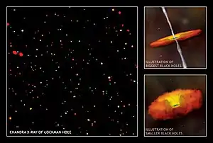 ![]() Mosaïque des sources de rayons X Chandra dans le trou Lockman. Code couleur: Énergie (rouge : 0.4-2keV, vert : 2-8keV, bleu : 4-8keV). Image est d'environ 50 arcmin par côté. |
