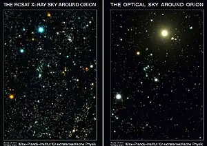 Sur la droite, c'est l'image visuelle de la constellation d'Orion. Sur la gauche, c'est Orion vu aux rayons X. Bételgeuse est facilement repérable au-dessus des trois étoiles de la ceinture d'Orion sur la droite. Les couleurs représentent la température de l'émission de rayons X de chaque étoile : les étoiles chaudes sont bleu-blanc, et les étoiles plus froides sont jaune-rouge. L'objet le plus lumineux dans l'image optique est la pleine lune, qui est aussi présente dans l'image aux rayons X.