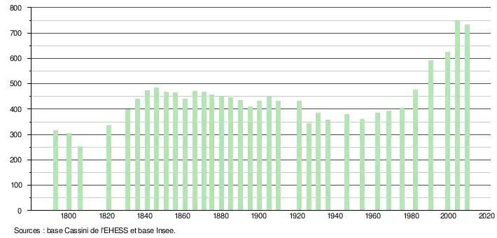 - Par convention dans Wikipédia, le principe a été retenu de n’afficher dans le tableau des recensements et le graphique, pour les populations légales postérieures à 1999, que les populations correspondant à une enquête exhaustive de recensement pour les communes de moins de 10 000 habitants, et que les populations des années 2006, 2011, 2016, etc. pour les communes de plus de 10 000 habitants, ainsi que la dernière population légale publiée par l’Insee pour l'ensemble des communes.