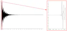Dans l'exemple ci-contre, le zoom sur la première partie de la FID montre l'activation des bobines de détection immédiatement suivie de la FID. On peut noter que le logiciel de traitement a automatiquement détecté le début de la vraie FID en ajustant l'axe des abscisses pour que 0,0 corresponde au début de la FID. Ceci est très important pour effectuer une transformée de Fourier discrète car les points précédant le début de la FID ne doivent pas être inclus dans la transformée de Fourier discrète.