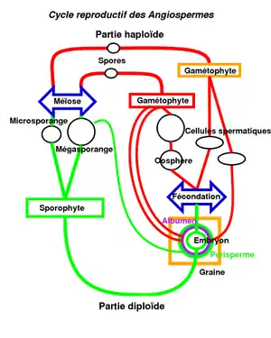 - en ocre, les phases mobiles : le gamétophyte mâle immature (grain de pollen) germe sur le stigmate, forme un tube pollinique qui transporte 2 noyaux spermatiques jusqu'à l'ovule. Alors que chez les gymnospermes l'un des deux avortait, ici on observe une double fécondation, l'une donnant l'embryon, l'autre l'albumen (triploïde dans la majorité des cas) par fusion d'un noyau spermatique et de 2 noyaux polaires issus du gamétophyte femelle.