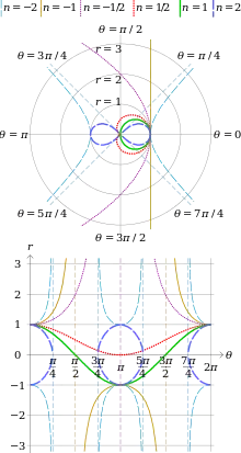 La courbe est bornée et formée d'un motif de base symétrique défini entièrement pour , fermé si n est positif, à asymptotes si n est négatif. On reconstruit la spirale entière par rotations successives du motif pour les angles , avec k entier.