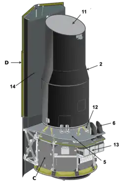 | A Partie optique : 1 - miroir secondaire ; 2 - enveloppe externe ; 3 - miroir primaire ; 11 opercule anti-poussières ; B Cryostat : 4 - compartiment instruments ; 10 - réservoir d'hélium ; C Module de service : 5 - bouclier module de service ; 6 - viseurs d'étoiles ; 7 - batteries ; 8 - antenne grand gain ; 9 - réservoir d'azote ; 12 - entretoises ; 13 - centrale à inertie ; D Panneaux solaires : 14 - bouclier panneaux solaires. |
