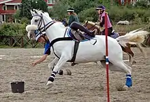- Pony games : jeux par équipe consistant en une série d'épreuves en relais ou en ligne où le cavalier, qui évolue individuellement, doit faire preuve d'habilité motrice et d'agilité pour réaliser un parcours sans faute tout en étant le plus rapide (remonter sur son cheval au galop, déplacer des balles sur des cônes…). Cette discipline permet de se préparer, sous une forme ludique, à l’apprentissage de toutes les techniques équestres. En compétition internationale, cette discipline est nommée mounted games[24].