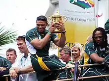 Elle entame la Coupe du monde contre les Samoa qu'elle bat 59-7[99]. Pour le choc contre les Anglais, tenants du titre, les Springboks sont encore une fois présents, très appliqués dans le jeu au pied et très réalistes[100], et ils s'imposent 36-0. Après deux autres victoires contre le Tonga[101] et les États-Unis, l'Afrique du Sud termine première de sa poule et affronte les Fidji en quarts de finale pour une victoire difficile 37-20[102]. En demi-finale, les Springboks confirment leur suprématie sur les Argentins (douze victoires et aucune défaite) et se qualifient pour la finale. Bryan Habana rejoint Jonah Lomu comme meilleur réalisateur lors d'une coupe du monde avec huit essais inscrits. En finale, les Sud-Africains confirment leurs belles prestations[103] en s'imposant contre les Anglais par 15 à 6, au cours d'un match sans aucun essai marqué.