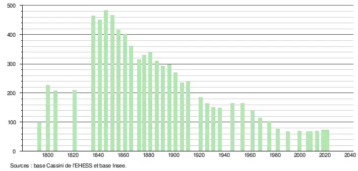 L'évolution du nombre d'habitants est connue à travers les recensements de la population effectués dans la commune depuis 1793. Pour les communes de moins de 10 000 habitants, une enquête de recensement portant sur toute la population est réalisée tous les cinq ans, les populations légales des années intermédiaires étant quant à elles estimées par interpolation ou extrapolation[26]. Pour la commune, le premier recensement exhaustif entrant dans le cadre du nouveau dispositif a été réalisé en 2008[27].