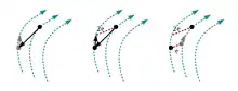 La première figure du schéma ci-contre montre le cas du retour sur trace simple : on peut remarquer que le retour sur trace récupère une vélocité (en gris) qui n'appartient pas à la bonne ligne de caractéristique. Le MacCormack permet de se rapprocher de la ligne de caractéristique (dernière figure du schéma, vecteur en gris).