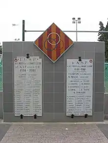 Inauguré le au stade de la Route de Thuir (futur stade Jean-Laffon)[13], le monument aux morts ne concernait que les joueurs de l'ASP tombés pour la France. Ils furent sept de l'équipe ayant disputé la finale le :