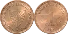| Avers : Blason illustrant une étoile rayonnante et légende « UNU MONDO · UNU LINGVO · UNU MONO » (« Un monde, une langue, une monnaie »). | Revers : Inscription de la valeur « 1 STELO » sur une étoile, au-dessus de laquelle il y a la légende « UNIVERSALA LIGO » et en dessous le millésime. Deux signes monétaires de la Monnaie royale des Pays-Bas. | ||||