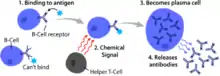 Le lymphocyte B avant d'être activé est appelé naïf. L'activation du lymphocyte B par l'intermédiaire des BCR déclenche une expansion clonale du lymphocyte activé, avec production de cellule mémoire, et déclenche à distance des cellules produisant des anticorps. Ces cellules produisant des anticorps sont appelés plasmocytes. L'activation du lymphocyte B par un antigène nécessite l'implication des cellules lymphocytaires T CD4.