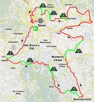 La course commence et se termine à Sienne, dans le site du patrimoine mondial de l'UNESCO[1]. La distance du parcours est portée à 127 kilomètres, tracée entièrement dans le sud de la province de Sienne en Toscane. La course est particulièrement connue pour ses routes blanches en gravier (strade bianche ou sterrati).
